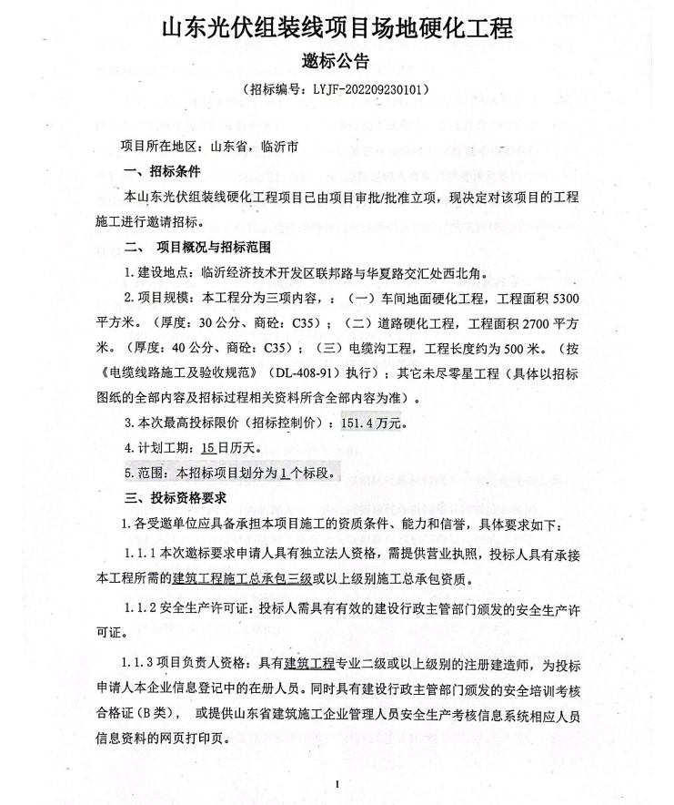 山东光伏组装线硬化工程项目招标公告